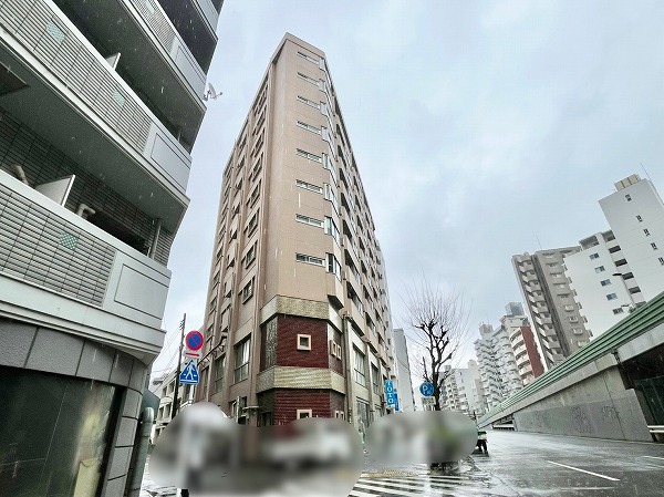 マンションの入り口は、人目が気になりにくい小道側にありました。商業ビルのようなアプローチですが、マンションプレートがあるのでわかりやすいですね。自転車がまとまって停められていました。