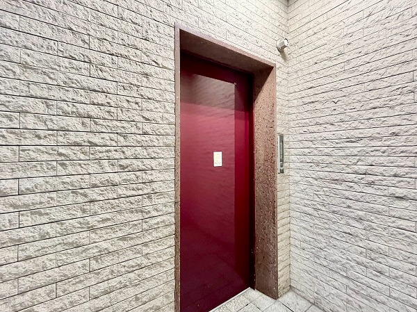 ワインレッドカラーのエレベーターで上がると、内廊下が続きます。こちらの階の住戸には同じくワインレッドカラーの扉が並び、レトロな雰囲気に包まれていました。外気が入らず、温度変化が少なく移動しやすい廊下です。