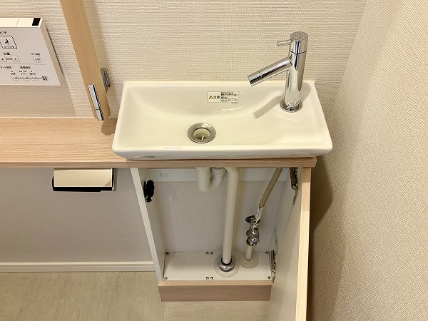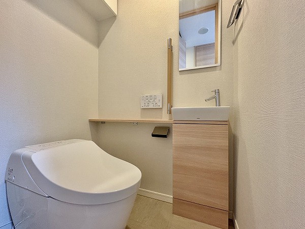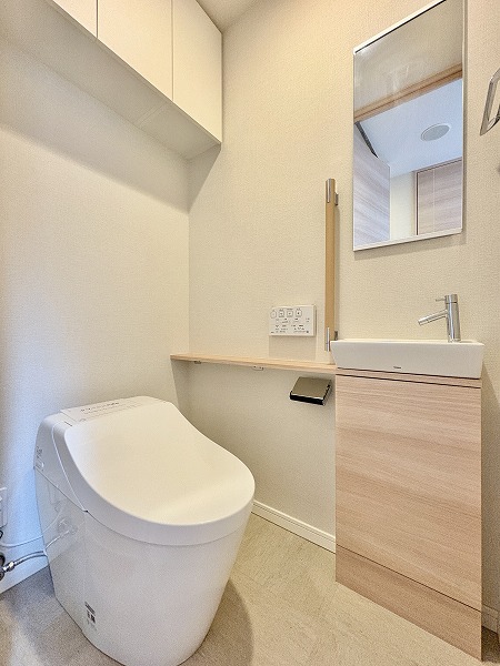 トイレはタンクレスで、お手入れがしやすそう✧独立した手洗い場が備わっていて、贅沢な造りです。鏡も付いているので、お手洗いついでに身だしなみチェックできるのも良いですよね。トイレの備品は吊り棚へどうぞ♪