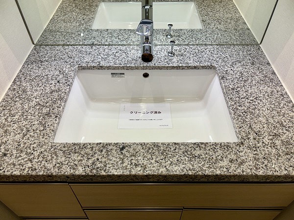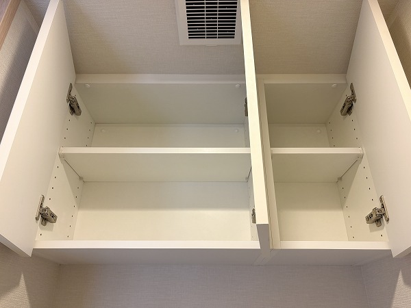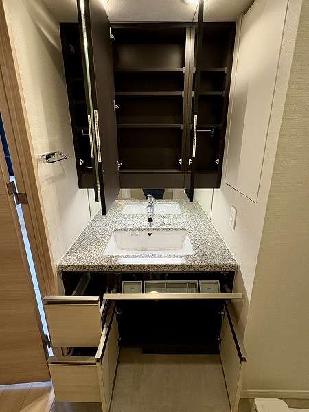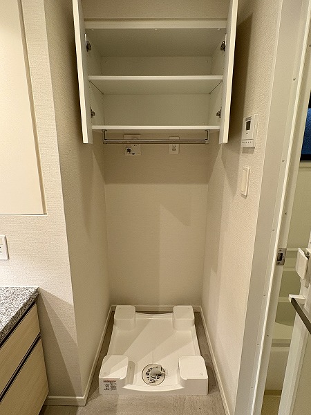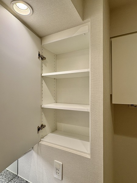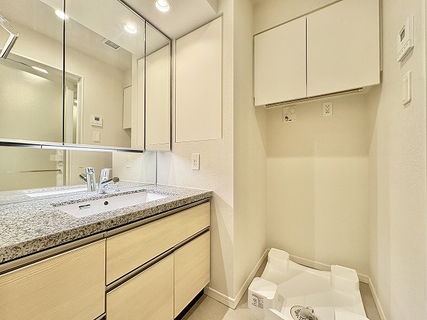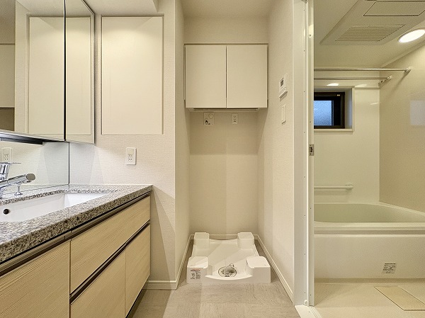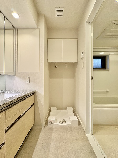 清潔感のあるサニタリールームは、独立洗面化粧台・洗濯機置き場・バスルームがまとまっている空間です◎洗面化粧台はミラーキャビネット仕様、洗濯機置き場の上には吊り棚と、収納スペースに困らないのが助かりますね。