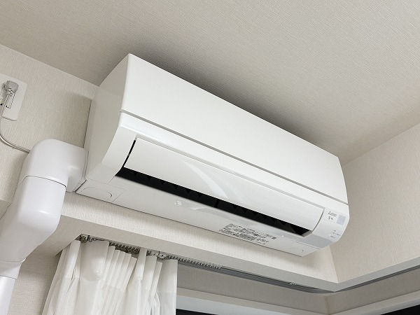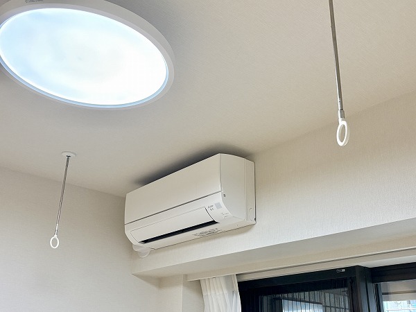 省エネ仕様の高性能エアコンがダイニングキッチンとベッドルームの両方に設置されています。初期費用が抑えられるのはもちろん、引越ししてきたその日から快適に過ごせるのが嬉しいですね✦天井にポールを取付けし、室内干しを行えるのも便利。