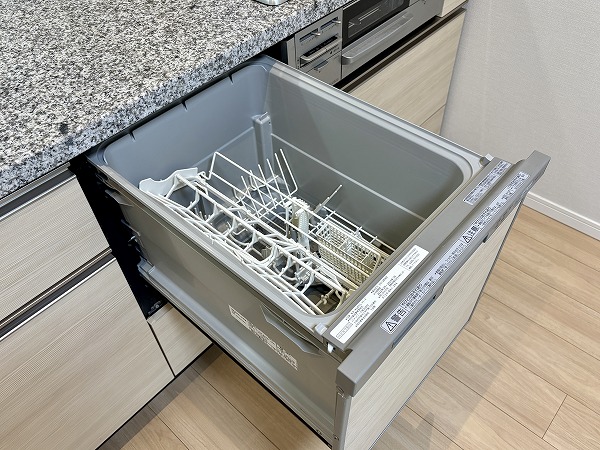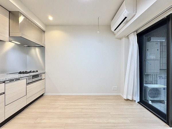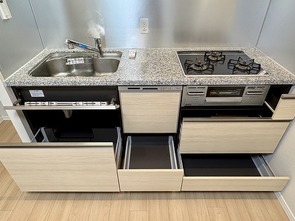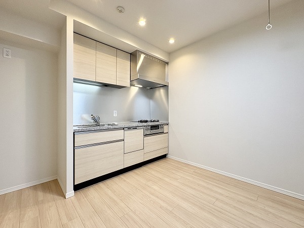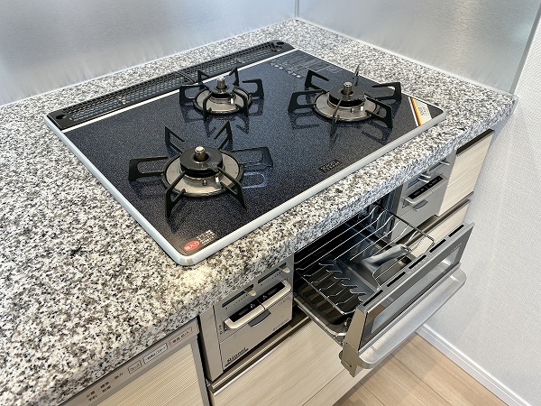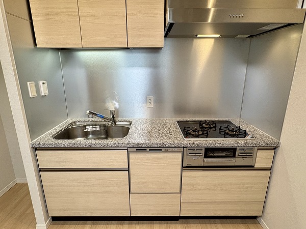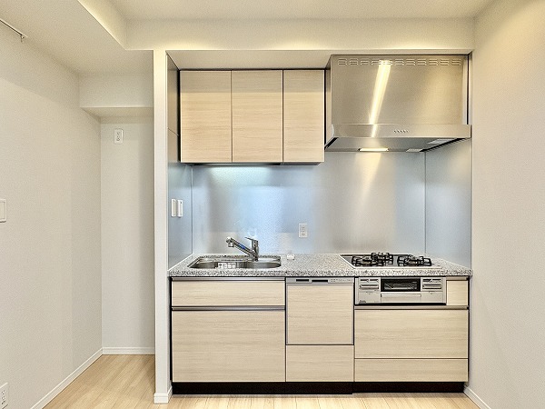 キッチンはダイニングルームのスペースを圧迫しない壁付タイプです✧お洒落なデザインで、お部屋の雰囲気も崩しませんね♪3口コンロにグリル、食洗機と、あると嬉しい設備が揃い、自炊派の方も満足していただけます。