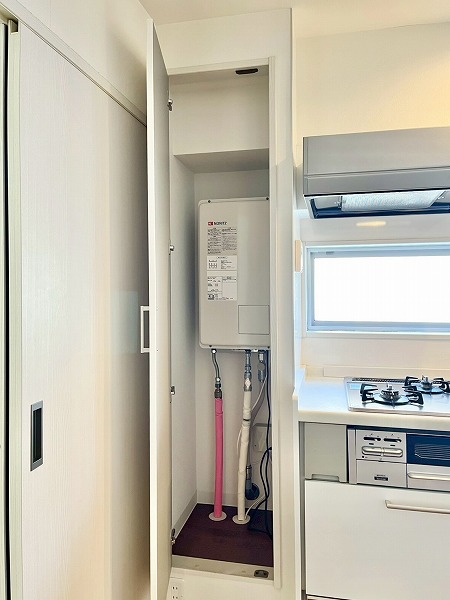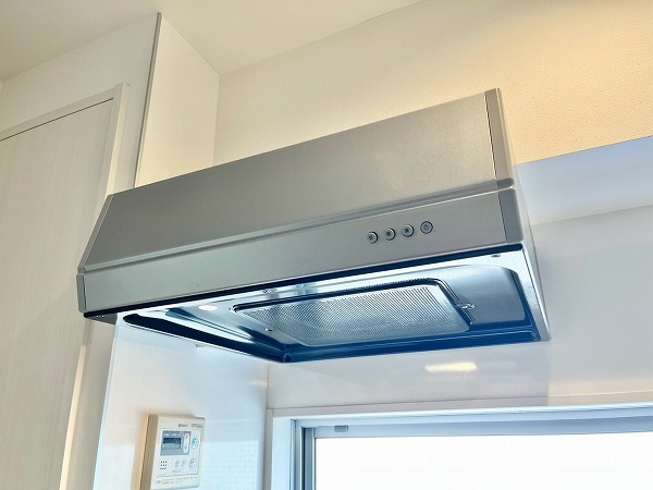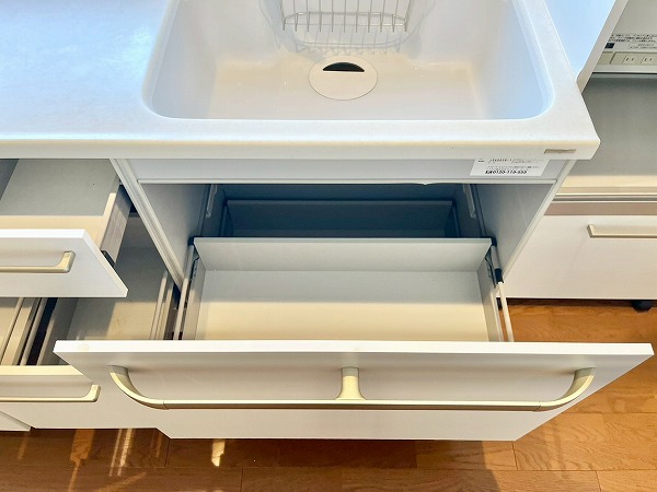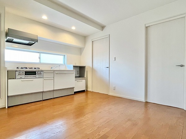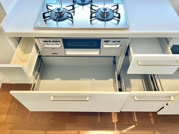 壁付けのキッチンには浄水器一体型水栓を採用し、後付けの手間もなし◎グリル付きコンロは多彩な調理に対応し、レンジフードで換気も十分。大型収納により、調理器具も美しく整理できます。