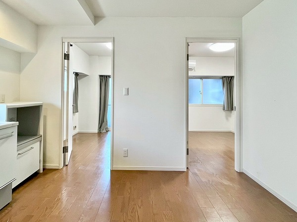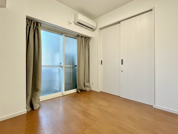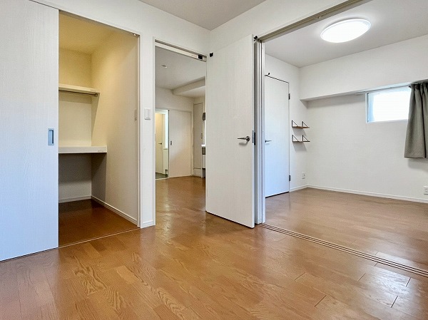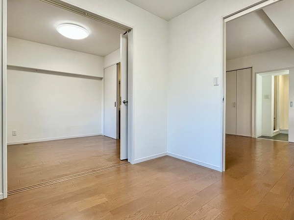 2つの洋室は引き戸を開け閉めすることで空間の使い方にバリエーションを生み出せます。開放して広く使うことも、それぞれ独立した居室として使うことも可能。両方の洋室にエアコンを完備しているため、個人の好みに合わせて温度を調節しながら快適にお過ごしいただけます。