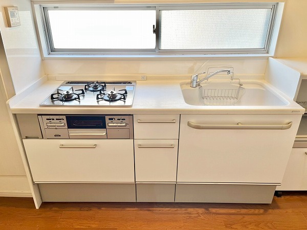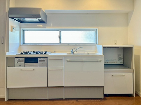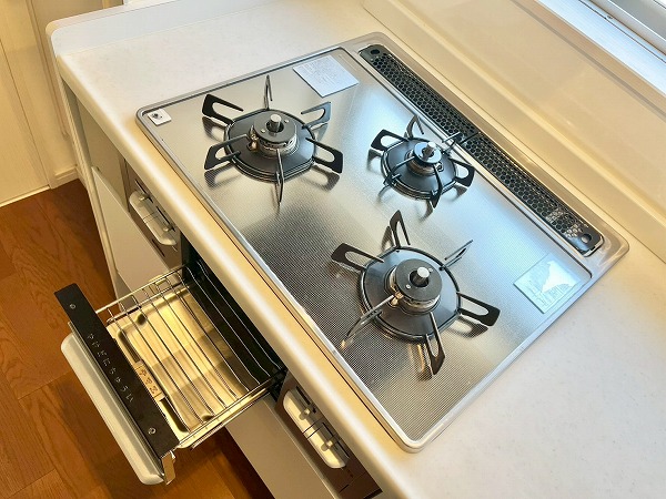 キッチンは壁付きタイプでメインルーム内にすっきりと収まり、他のインテリアの邪魔にならない配置。マットな質感のワークトップには3口コンロが設置され、お料理がはかどりそうですね。窓からの光が優しく手元を照らす、清潔感に溢れるキッチンです。