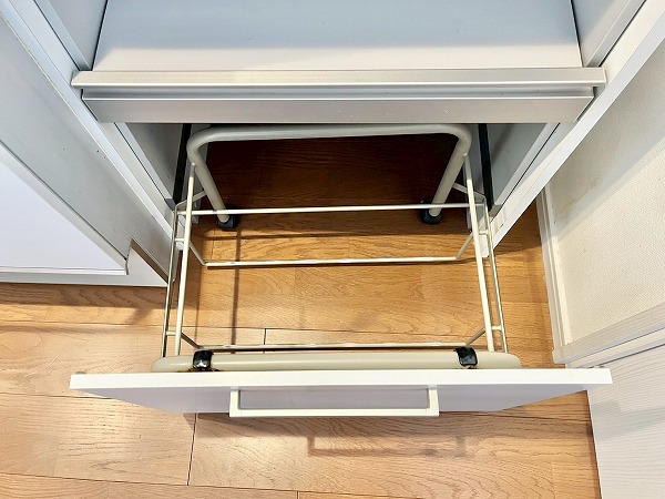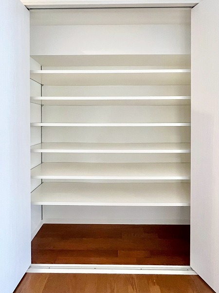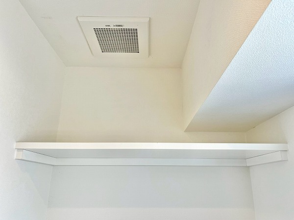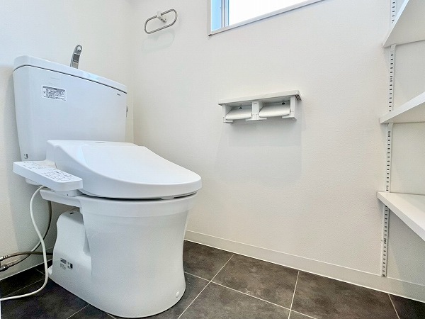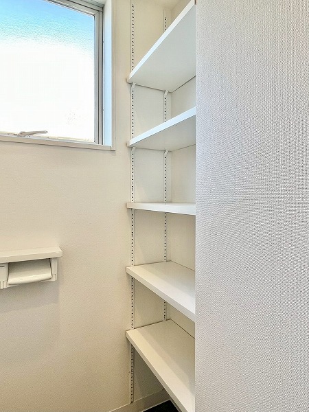 パウダールーム内から出入りできるトイレには、天井近くまで高さのある収納棚を設置。トイレットペーパーや掃除用品、日用品のストックまでまとめることができ、狭い個室内を整然と保てるのが嬉しいポイントです。