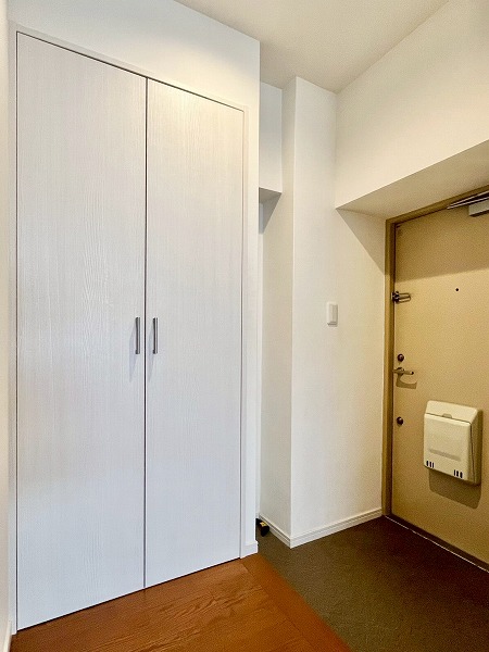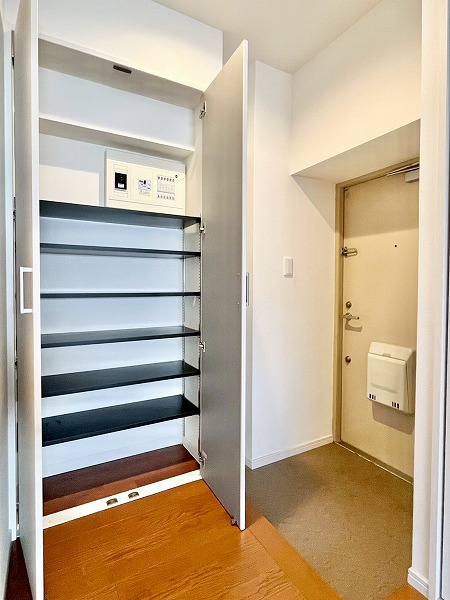 1LDKの室内はホワイトの木目調で統一され、明るく清潔感のある印象です✧玄関には大容量のシューズボックスを完備。天板をディスプレイスペースとして活用すれば、上品な玄関コーディネートも可能です。