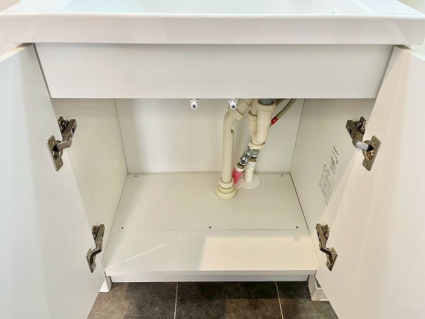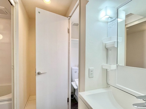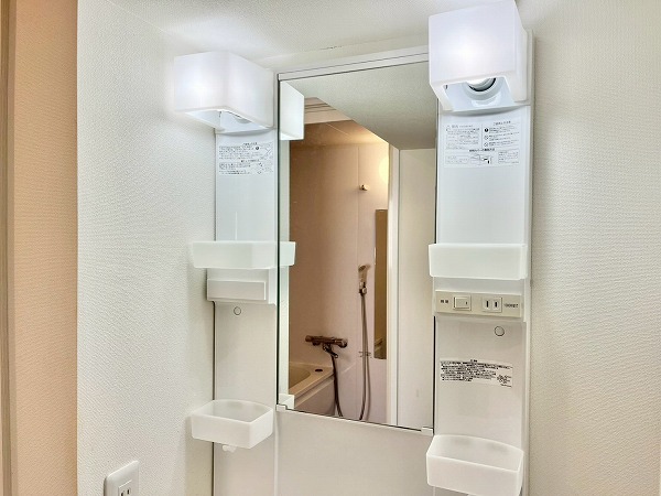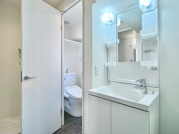 パウダールームは正面に洗面化粧台、左手に洗濯機置き場が設けられた使いやすいレイアウト。洗面ボウルはゆとりのあるサイズ感で、朝の身支度がスムーズに行えそうです。ミラーの両サイドには小物を置ける棚が備わり、スキンケアアイテムやドライヤーなどがぴったり収まります。