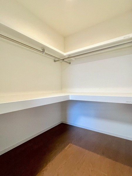 2つの扉のうち向かって右側の扉の先は、2段式のウォークインクローゼットを備えた洋室になっています。お洋服の入った衣装ケースや段ボール、大きな趣味の物がある方でも問題なくしまっておけそうでした。居室内はベッドとデスクを両方置いても快適に過ごせるサイズ感です◎