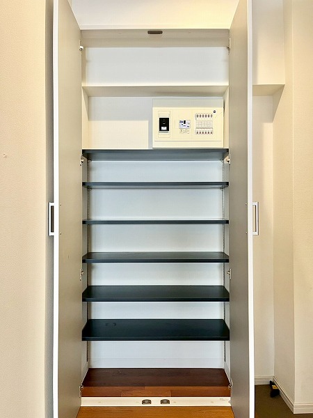 洗濯機置き場は扉の中に収納可能で、生活感や音を抑えられるスマートな設計。インテリアの邪魔にならず、横の奥行きある戸棚には多くの荷物を収納可能です。