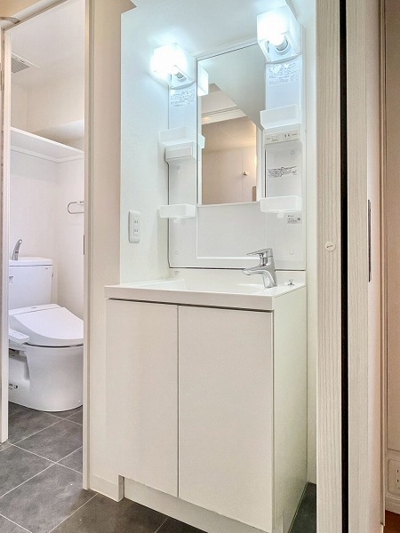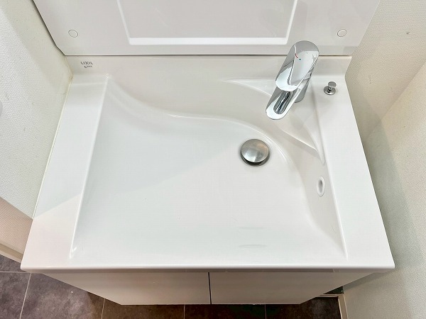 3面鏡付きの洗面化粧台は、身支度を快適にサポート◎シンプルで上品なホワイトデザインで、ミラーキャビネットや下部収納で小物を整頓でき、整った印象のサニタリースペースを保てます。