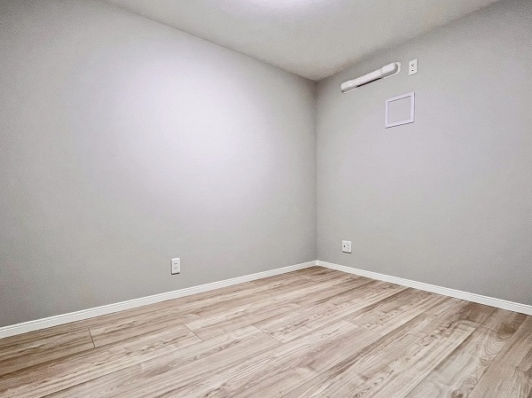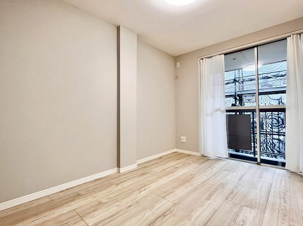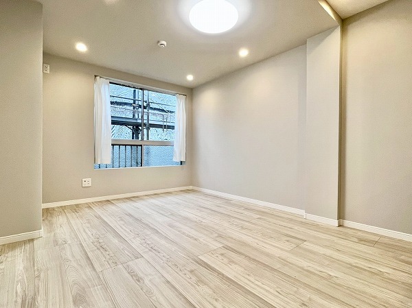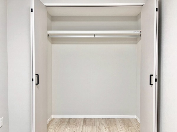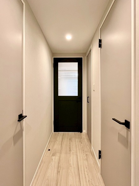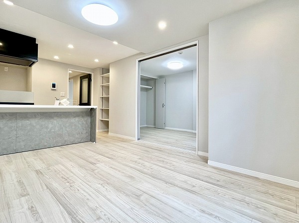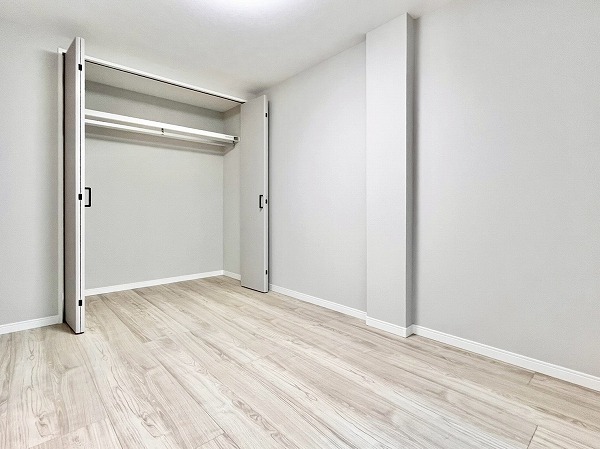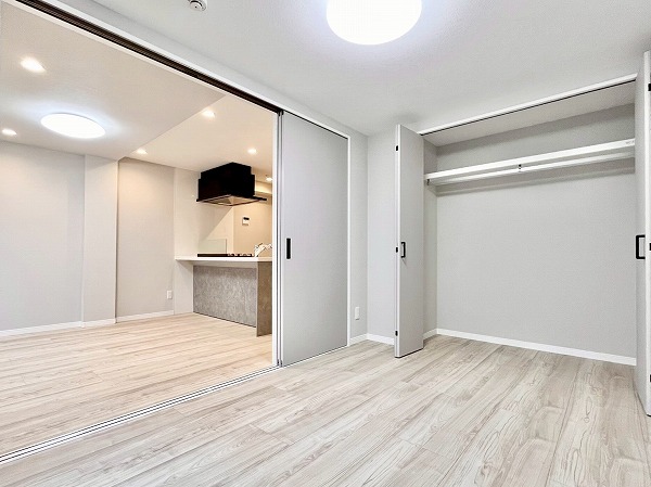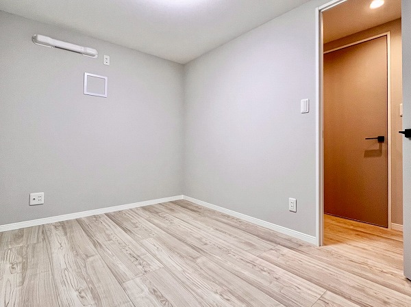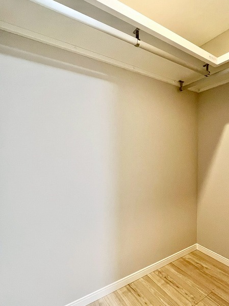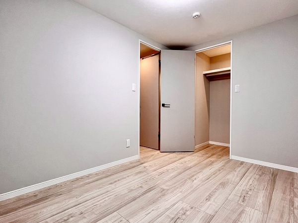 廊下から出入りできる洋室は窓がないため、光の入らない空間でゆったりと身体を休めるのに最適。およそ6帖あり、大きめのベッドをおいても圧迫感の出ないサイズ感がありがたいですね。室内にはウォークインクローゼットを備え、起床後の身支度も自然に行えます。
