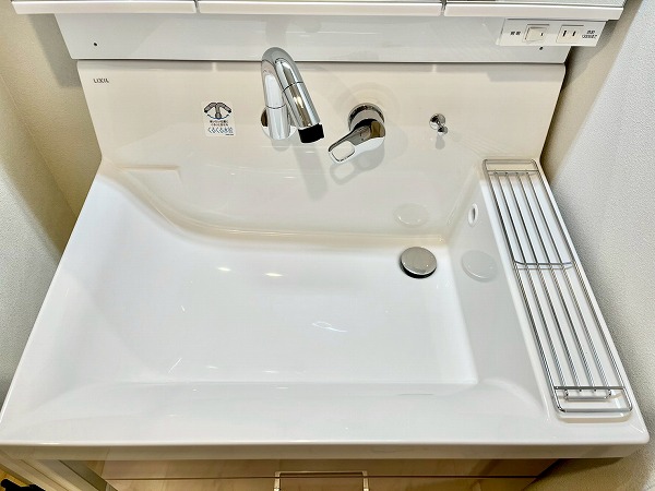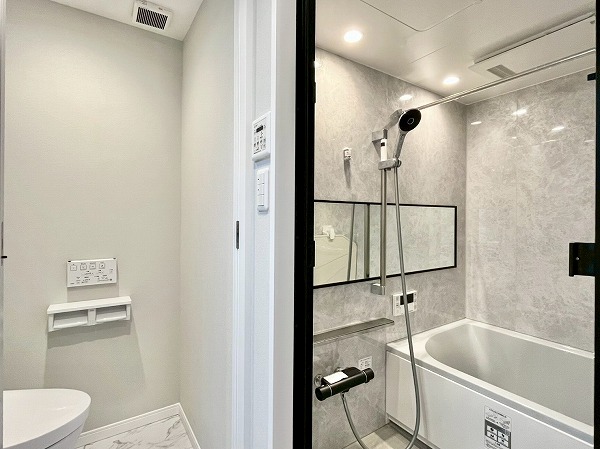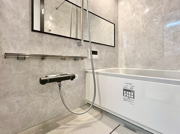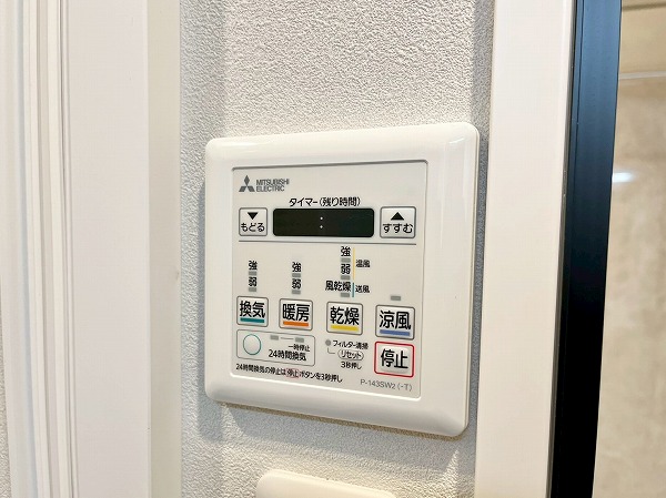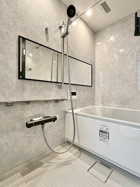 バスルームにはミラーの縁や水栓にブラックが使用され、ぐっと引き締まった印象を演出。1日の終わりにクールダウンできる、落ち着いた空間に仕上がっていました。浴室乾燥機能を搭載し、ちょっとしたお洗濯物や雨の日でも気兼ねなく乾かすことができます。