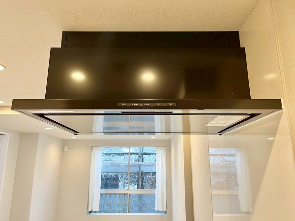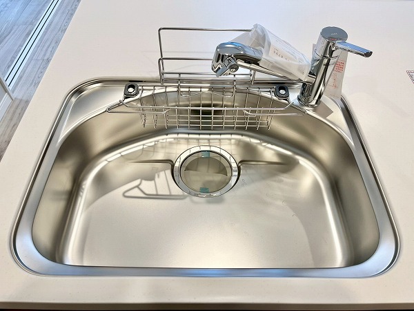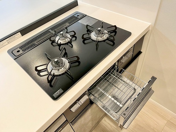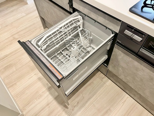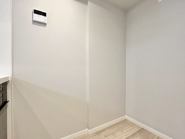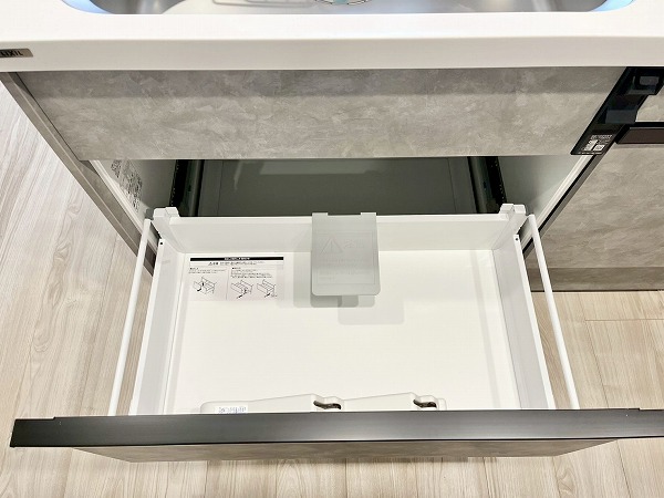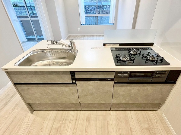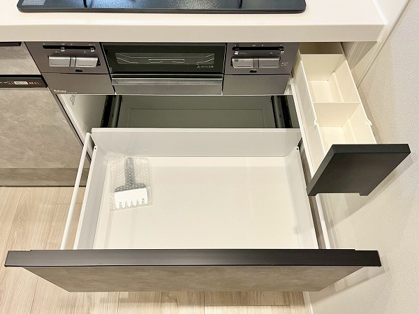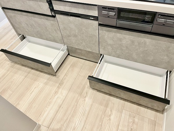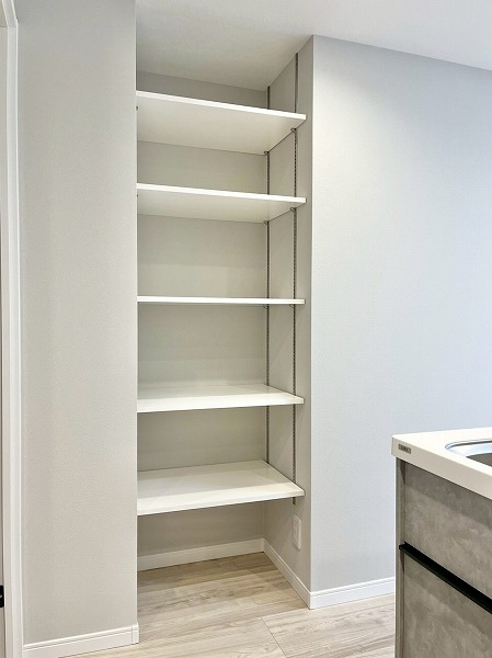オープンタイプのキッチンには、穏やかなグレートーンが採用され、料理の時間を心地よく演出します。左側にはストッカーを設けており、パントリーのようにも使える設計。食材や日用品をまとめて収納すれば、空間を有効に使えるのも嬉しいポイントです。