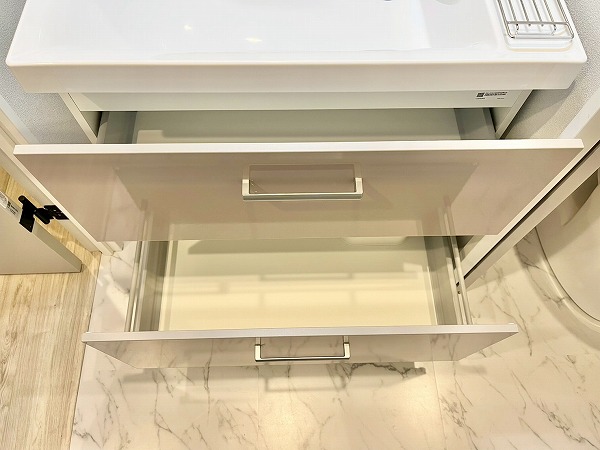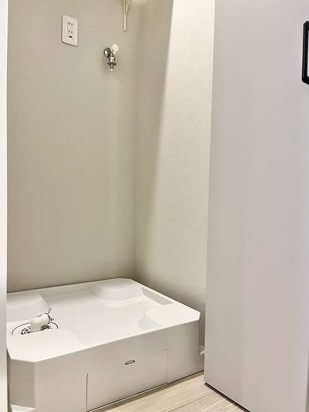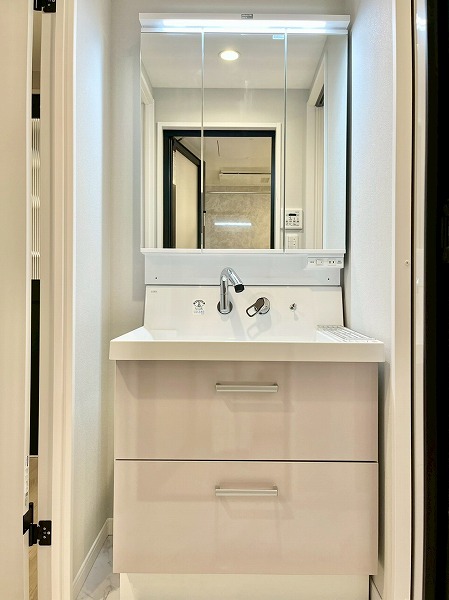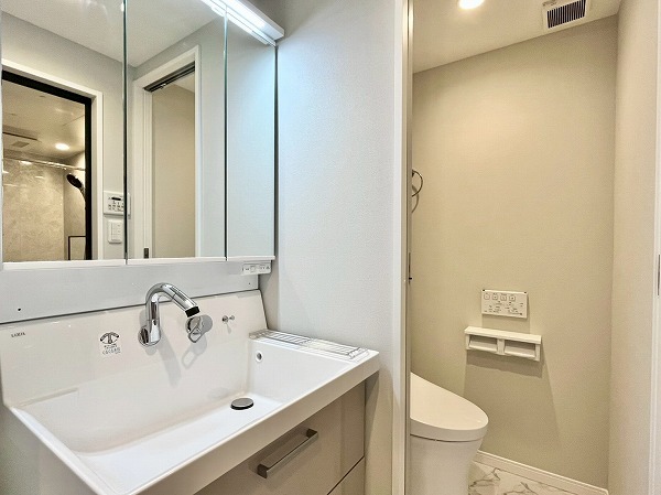 洗面スペース・トイレ・バスルームが集合したパウダールームは、朝や夜の身支度がこの空間1つで完結する効率の良さが魅力。洗濯機置き場は廊下を出てすぐ隣に配置されており、狭さを感じがちなパウダールームにスペースを確保しつつ、家事動線にも支障をきたしません。