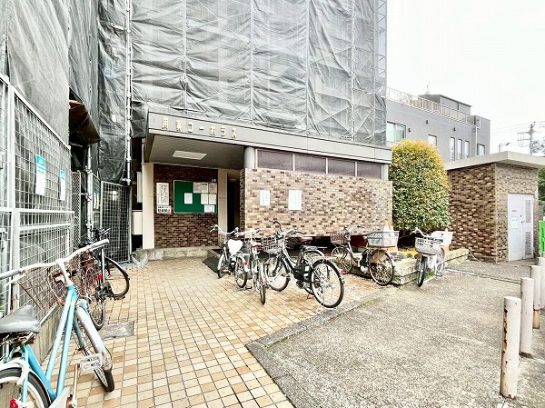 小道を入った住宅街の中に建つ『用賀コーポラス』。鉄骨造・8階建てで、総戸数は56戸。撮影の日は大規模な修繕工事が行われており、中も外もシートで覆われていました。美しく生まれ変わり、住みやすくなるのが楽しみなマンションです。