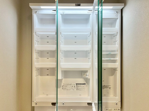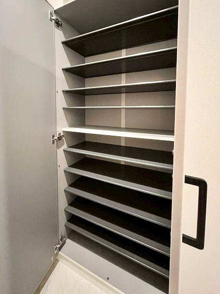 玄関にはミラー付きシューズボックスを設置し、お出かけ前後のコーディネートチェックに便利です。シューズボックスは両開きタイプで収納力があり、2人分の靴もすべて余裕で収まります。鍵や折りたたみ傘もまとめて置いておくことで、出入りがよりスムーズに✧