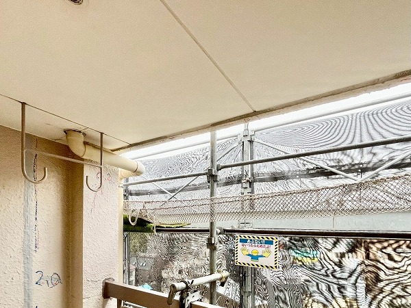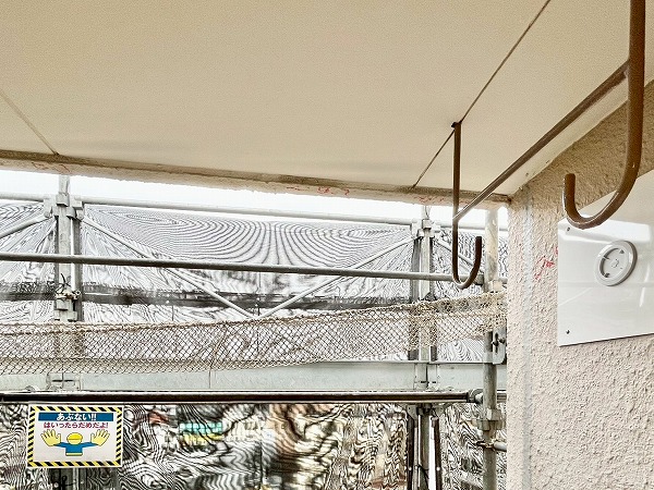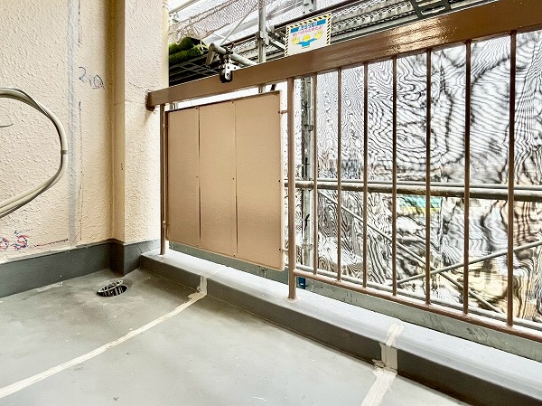 通気性の良い外廊下。一部に壁が設けられており、移動の際にも風や雨を適度に遮ってくれそうです。工事によりペンキが塗られたり、ドアが新しいものに交換されたりと、着々と準備が進められていました。