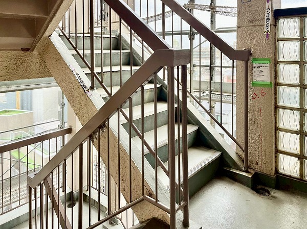 エントランスを入ってすぐのところに、エレベーターが1基設置されています。後ろには外階段が設けられ、朝など混み合う時間帯には併せてお使いいただくと時間短縮になりそうです。