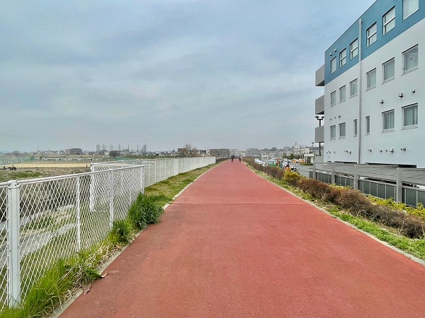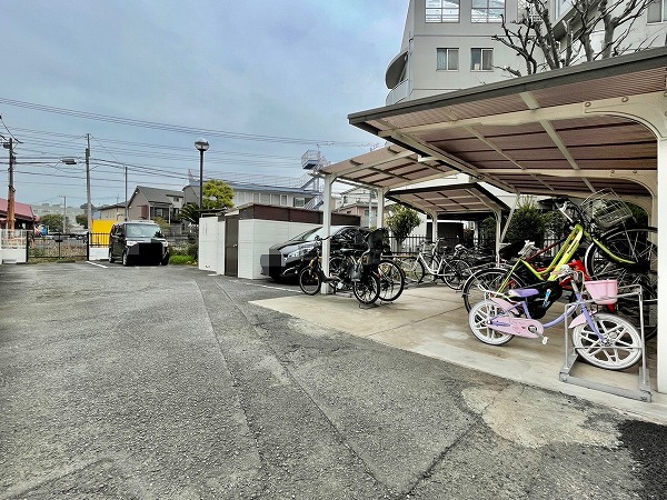 アプローチの突き当たり、建物の裏側には各種車両置き場を完備。お天気が良い日は川沿いをサイクリングしてはいかがでしょうか。