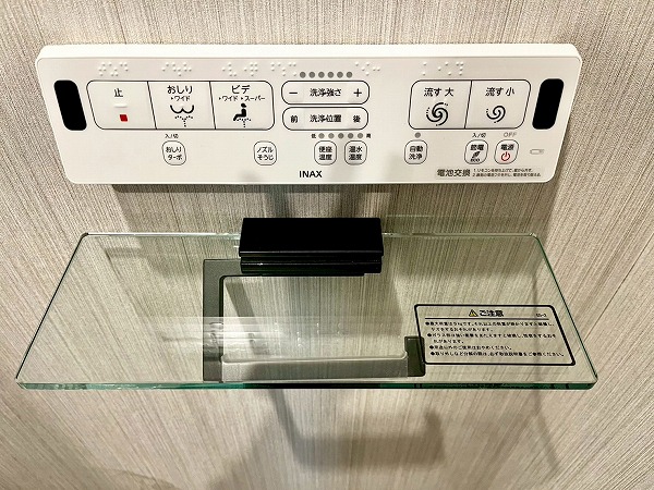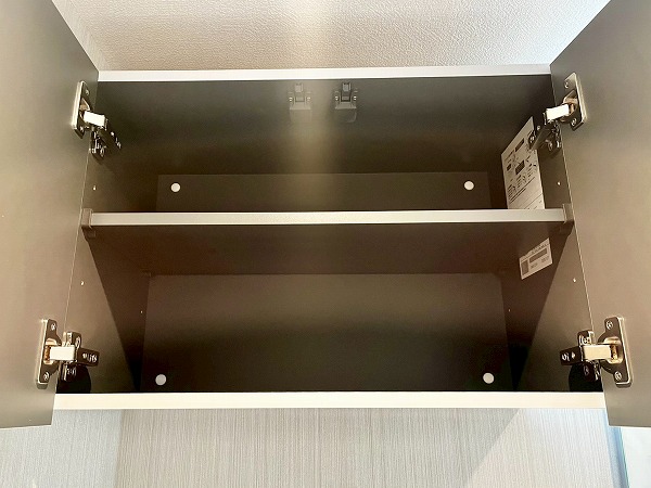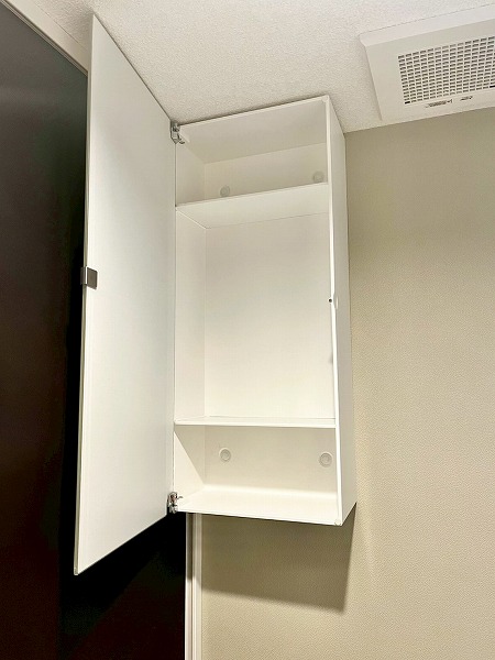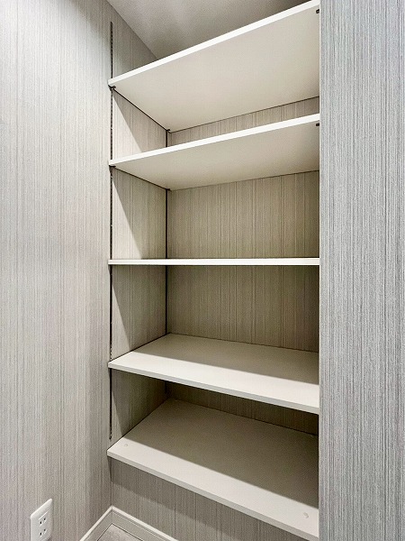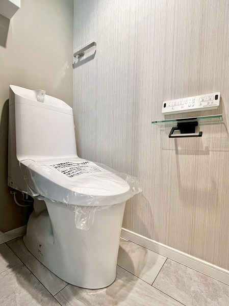 トイレはライトグレーのアクセントクロスがスタイリッシュな印象を添え、清潔な空間。ウォシュレットパネルの下にあしらわれたガラスが爽やかな印象です。上部にも同じくガラス製の扉がついた棚が設けられ、トイレットペーパーなどの保管にぴったりなサイズ感。