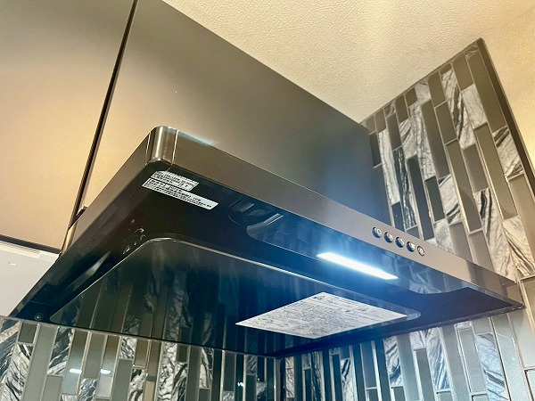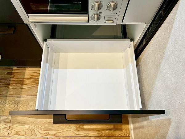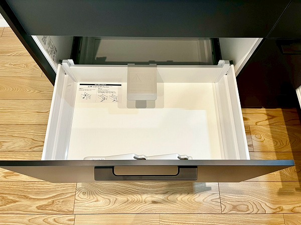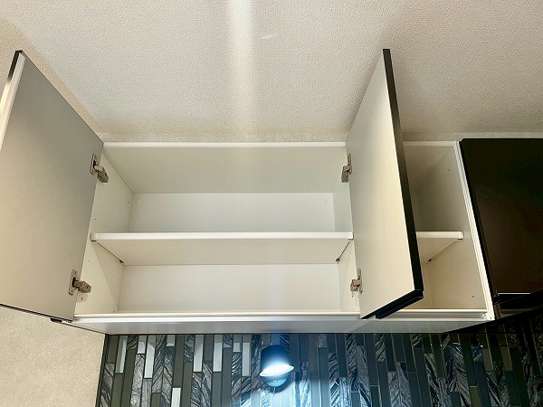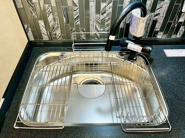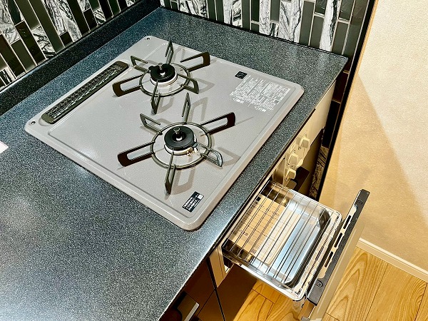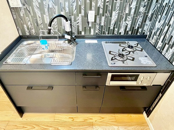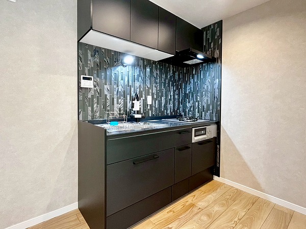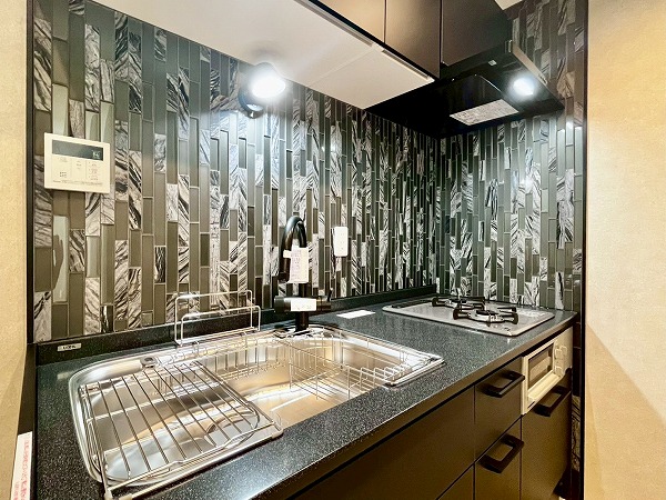 キッチンはブラックを基調にまとめられ、ランダムに張られたレンガ調のパネルが遊び心をプラス。上部とシンク下に大きな収納を備えており、調理器具の他にも食器をしまっておけそうな広さがありました。メインルーム内の奥まった場所に位置しており、料理と生活のスペースを分けたい方にはぴったりです。