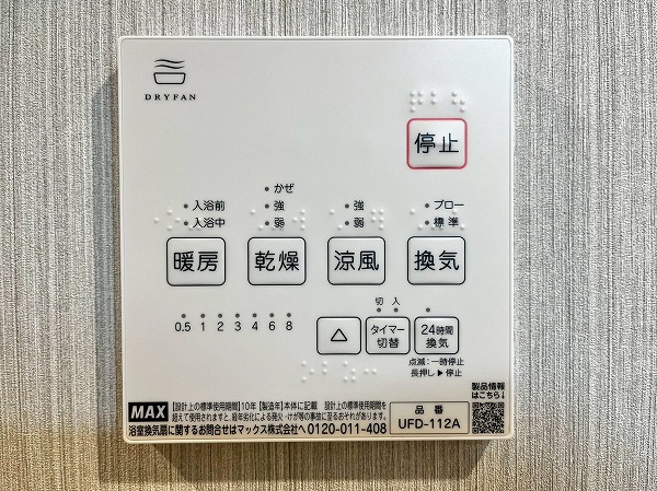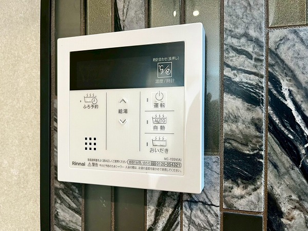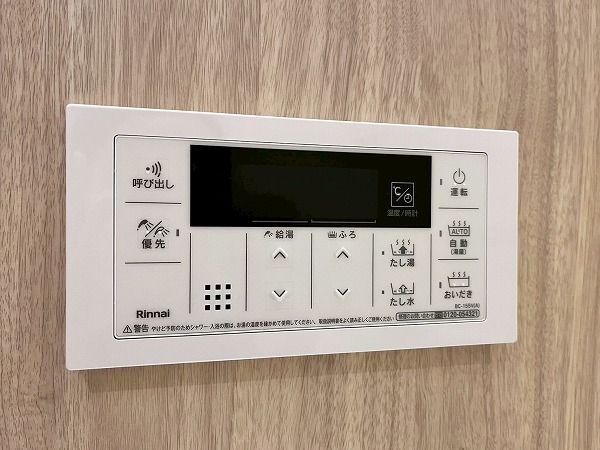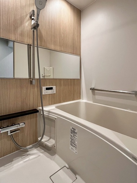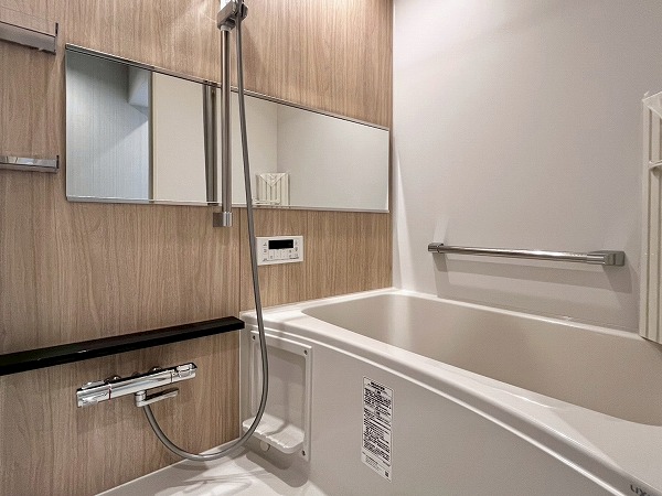 ゆったりと足を伸ばしてくつろげるバスルーム。横長の鏡やバスタブ脇の手すりに至るまで、使いやすさが考えられた造りになっています。浴室に備えられた換気・暖房機能のおかげで、1年を通してさらりと心地よいバスルームを保ってくれそうです。