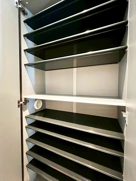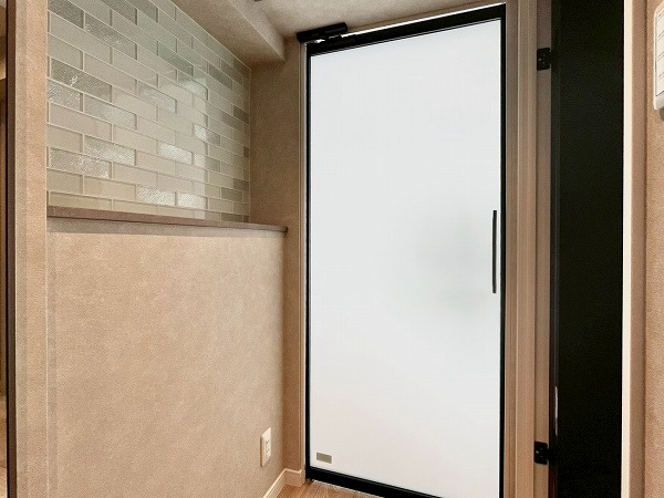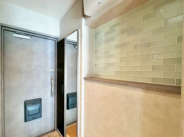 玄関周りには使い勝手の良いミラー付きのシューズボックスと、カウンターを設置。お部屋全体の雰囲気に沿った淡い色のカウンタースペースにお花やアートなどを飾れば、帰宅するたびに華やかな気持ちになれそうです。鍵や折りたたみ傘の置き場所として実用的な使い方も◎