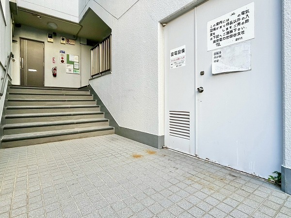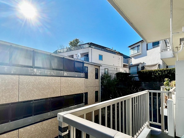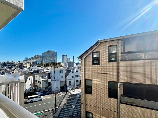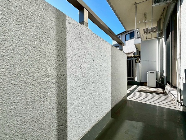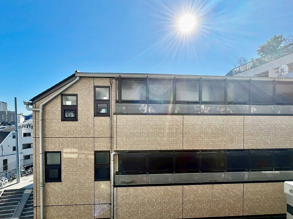階段を登りきると、明るく開放感のある見晴らしの良い外廊下が続きます。私物などは放置されておらず、マナーを守った利用がなされているようです。目の前は大通りに面していないので、通りの視線はあまり気にならない造り。