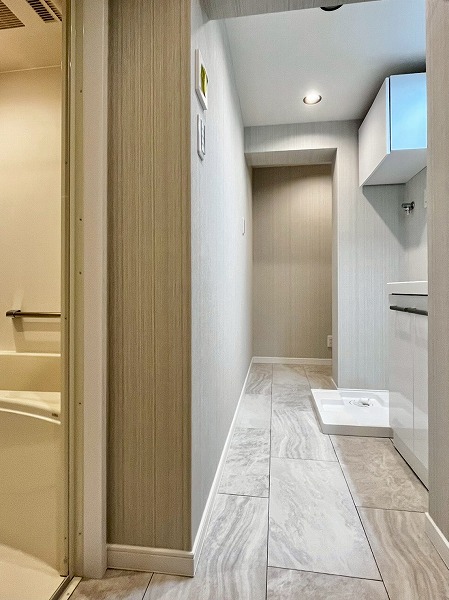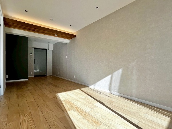 3階に位置する1LDKは12.8帖。ソファとローテーブルを置いても余裕のある、ゆったりとした暮らしが叶いそうです。さりげなくあしらわれた木目に柔らかな間接照明が照らす天井に、グレーのクロスが呼応し、センス良く磨き上げられた空間のスタイリッシュさに魅了されます。