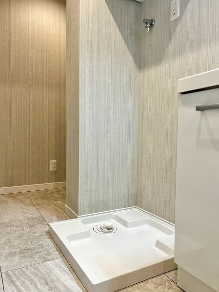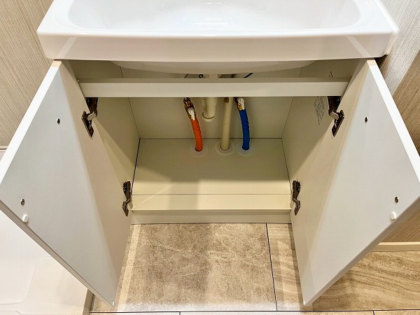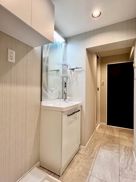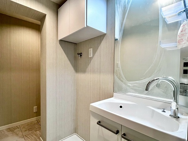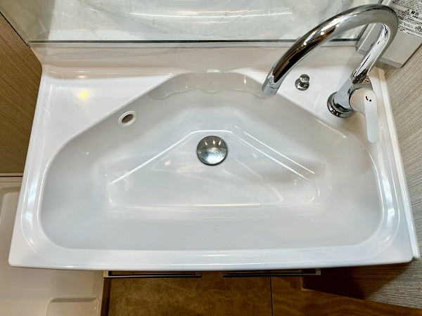 洗面化粧台は大きな鏡とJ字型の水栓のしつらえがお洒落。パウダールームはかなり広めに造られているのがポイントで、忙しい朝でも、身支度がストレスフリーに行えそうです。突き当りにはタオルなどの保管に便利なオープンシェルフも設置。
