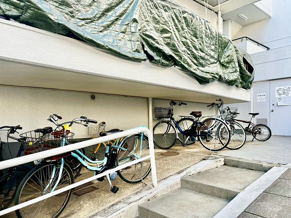 マンションの外に設けられた段差を上り、アプローチへと向かいます。車輪が付いたものは坂道を利用して通ることができそうですね。自転車はマンションの下部にまとめて置かれており、雨に当たらずに保管できそうです。
