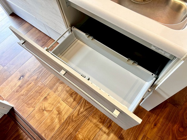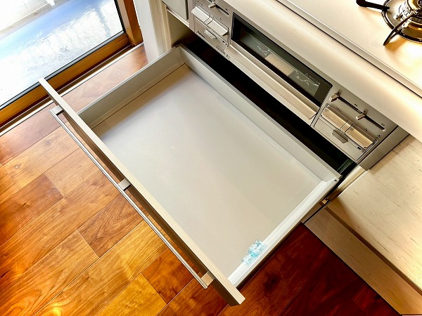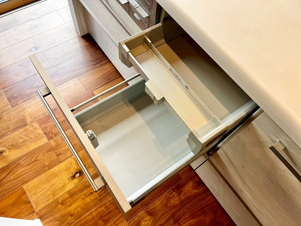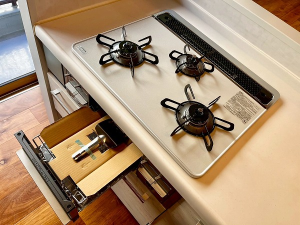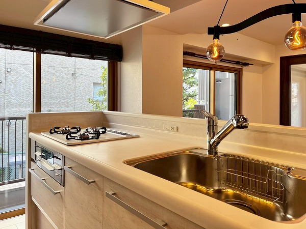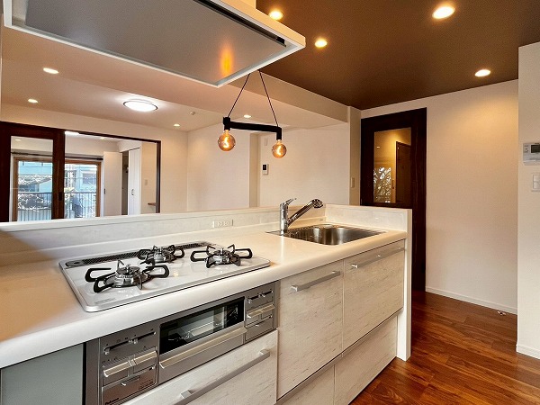 3口コンロを搭載したオープンキッチンは、広くお部屋を見晴らすことのできる快適な料理スペース。左手には窓が設けられ、お料理の手元を優しく照らします。お部屋への入り口に近く、お買い物をして帰って来た際にそのまま冷蔵庫に向かえる動線の良さが便利。
