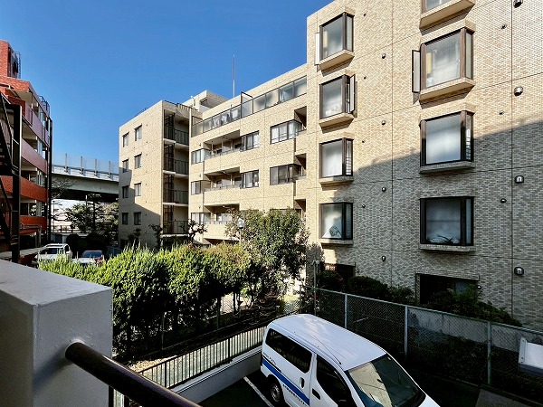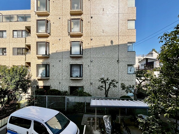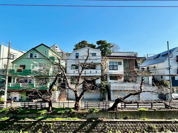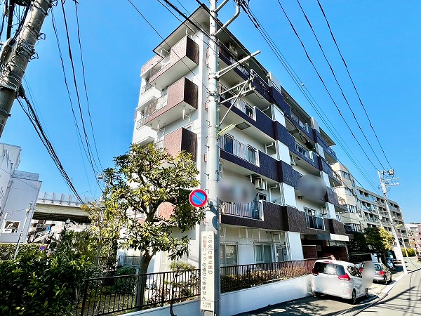 二子玉川の住宅街を抜け、丸子川のほとりに佇む『ドミール二子玉川』。鉄筋コンクリート造5階建てのマンションで総戸数は24戸とちょうどいい規模感。爽やかな白壁が目を引きます。
