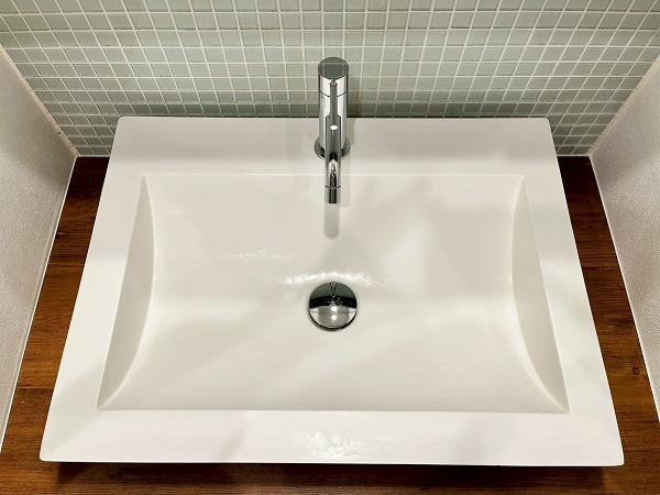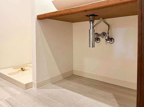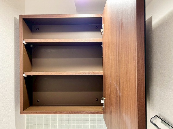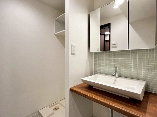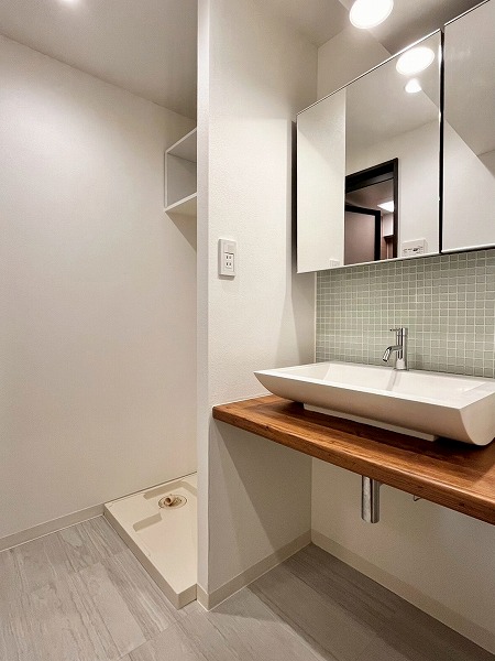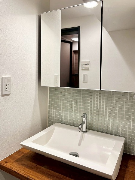パウダールームは、フロートミラーとペールグリーンのタイルが軽やかな印象。スキンケアグッズはミラー裏の収納へしまっておくことができます◎シンク下は大きめのかごなども置けそうな高さがあり、リネン類やストックの置き場として活用しそうです。