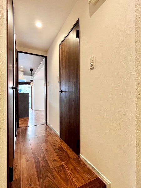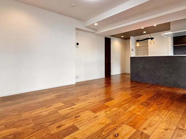 2階に位置する1LDKの角部屋は、温かな木目と、ところどころに設けられたブラックカラーが大人の余裕を醸し出す隠れ家的空間。グレーのアクセントクロスが貼られた天井が空間をスタイリッシュにまとめ上げ、ワンランク上の洗練された生活スペースへと格上げしてくれます。