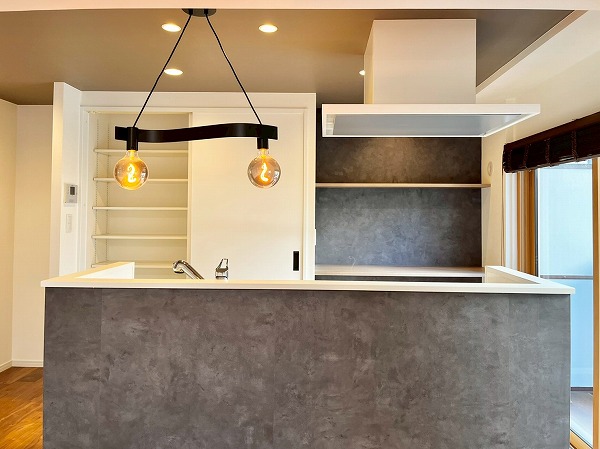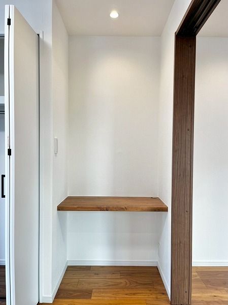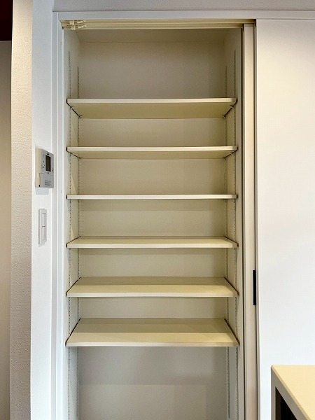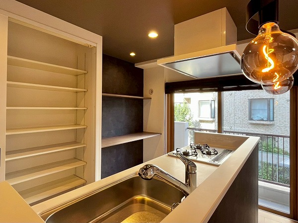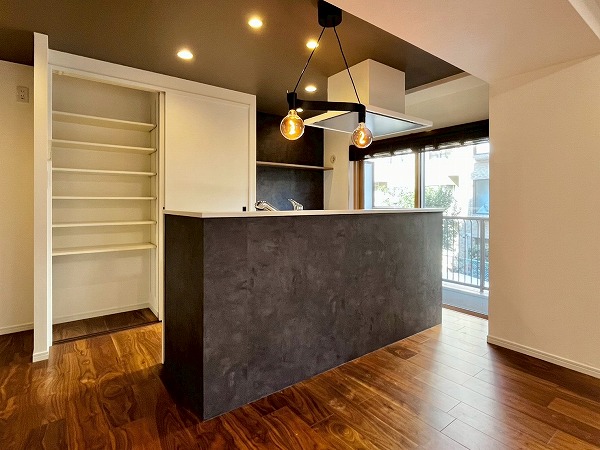 キッチン背後には大容量のパントリーとカウンターを完備。扉が付いたパントリーは食品を直射日光から守り、安全に保管することができます。ホワイトとグレーのコントラストが素敵なカウンターには電気調理器具を並べて、見た目から気分の上がるスペースが完成✧