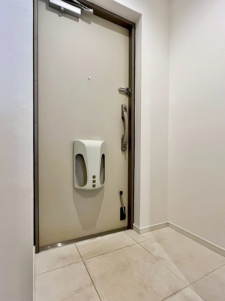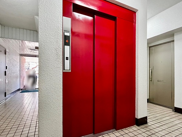 光沢あるボルドーカラーがぱっと目を引く内廊下。夏場の害虫や、冬場の冷風の入り込みを防ぎます。エレベータ・内階段も同じような赤色で揃えられており、上質な雰囲気漂う共用部です。
