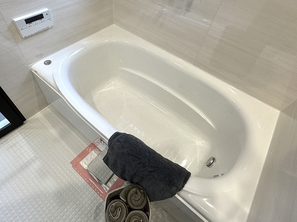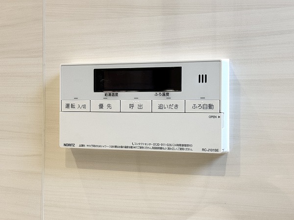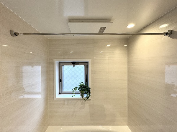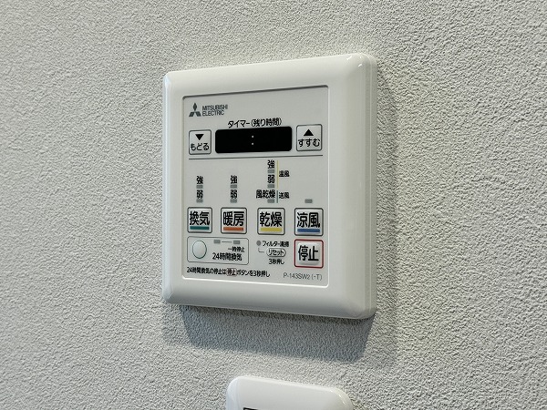 淡いベージュトーンが柔らかな雰囲気をつくる浴室。追い焚き機能と浴室乾燥機が完備され、家族それぞれのタイミングで快適な温度でバスタイム堪能♡また、雨の日には干し場としても活躍し、暮らしの安心をそっと支えますよ。