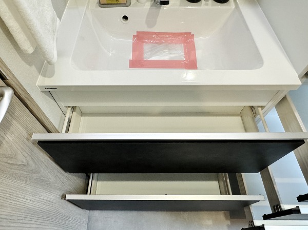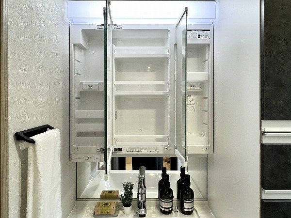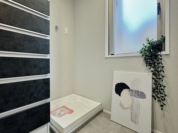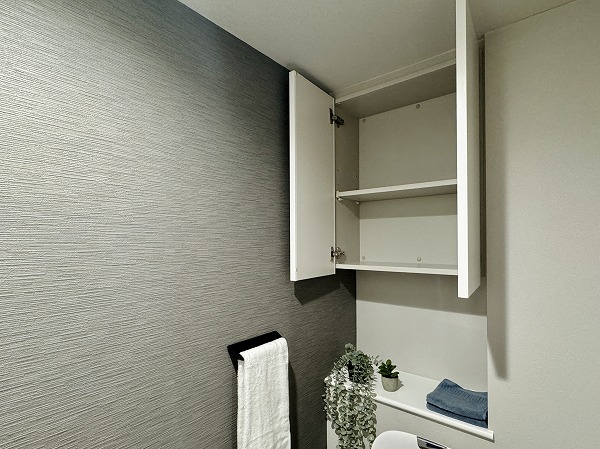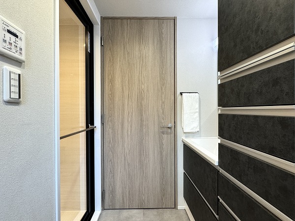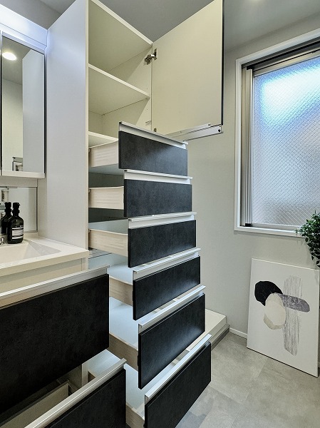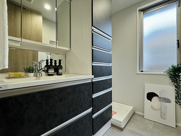 収納キャビネットが随所に配置され、見た目の綺麗さだけでなく実用性もしっかり備わったサニタリールーム。リネンからスキンケア類まで分けて整理できるので、毎日の身支度もスムーズです。小窓があることで、湿気がこもりにくく空間に広がりを感じさせてくれるのも魅力。明るさと開放感が日常を心地よくしてくれます。