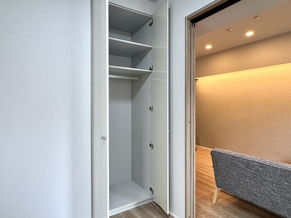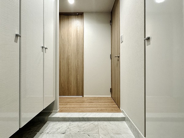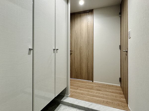 ホワイトのストーン調タイルが敷かれた玄関は、住まいの第一印象をぐっと高める上品な仕上がり。左手には大容量のシューズクロゼット、右手には奥行きのある収納が備わり、靴だけでなく雑貨やアウトドア用品までしっかり収まります。玄関まわりが整うことで、帰宅時の気分も自然と軽やかに♪