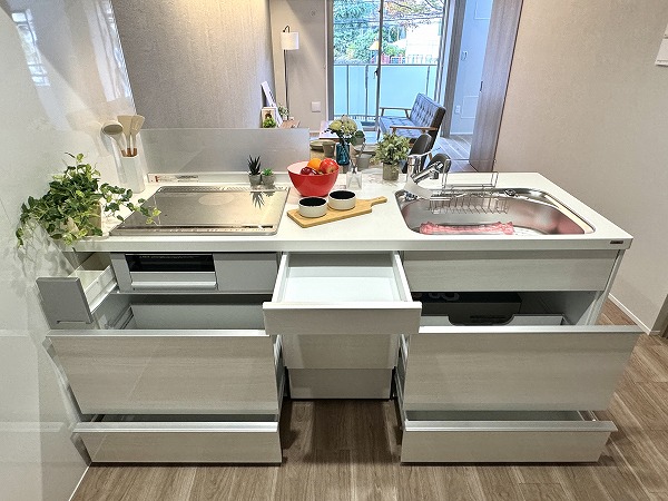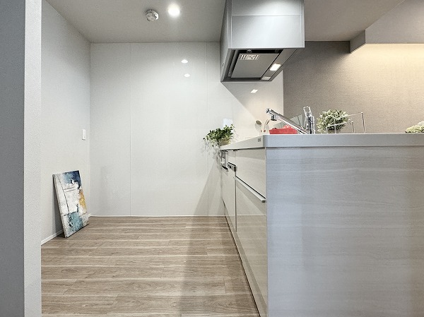 見通しの良い対面キッチンは料理中でも部屋全体を把握でき、ペットやお子さまの存在を感じながら作業ができて安心◎さらにビルトインの食洗機を備え、日々の家事の負担をぐっと軽減してくれます。背面のスペースはストレスのない広さがあるため、家電を置きたい方や調理アイテムを充実させたい方にもピッタリ。料理の時間がもっと楽しくなる空間です。