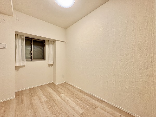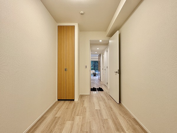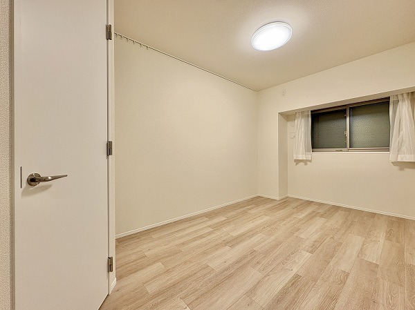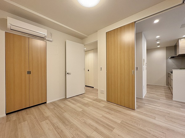 メインルームとスライドドアで仕切られた洋室は約5.0帖。廊下やメインルームからのアクセスがスムーズで、家事や生活動線に配慮した設計です。クローゼットも完備されており、衣類や季節のアイテムを整理して収納できるのも安心ポイント。子ども部屋や書斎、趣味のスペースなど、使い方の自由度も高いお部屋です。