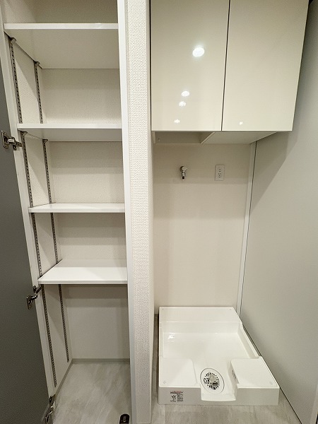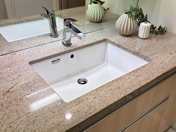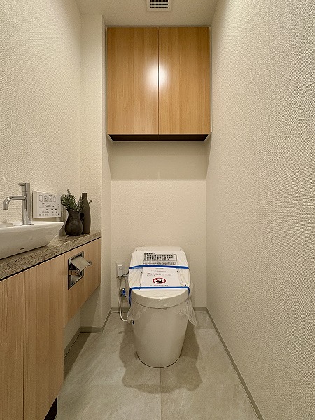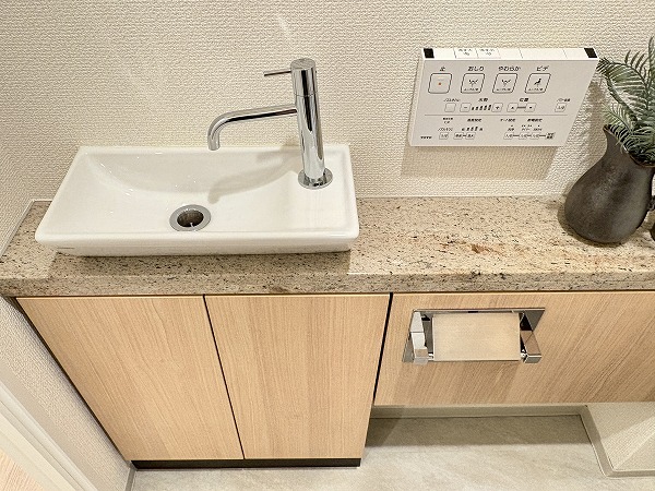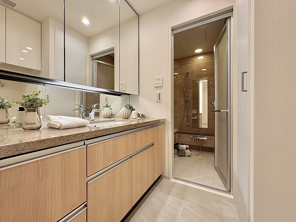 上品なオフホワイトで統一されたサニタリースペースは、清潔感と洗練された印象を併せ持ちます。木目調の洗面化粧台が温かみを加え、両サイドに設けられたカウンターはメイクやヘアセットなど、日常の身支度を快適にサポート。使いやすさとデザイン性を両立させた空間です✧
