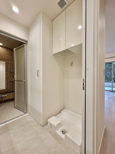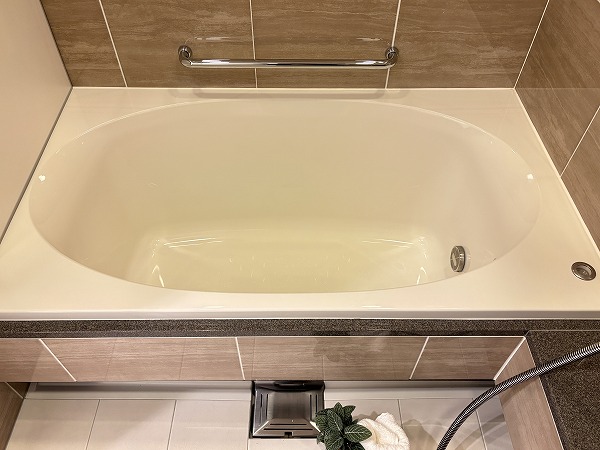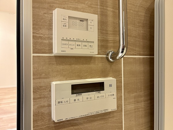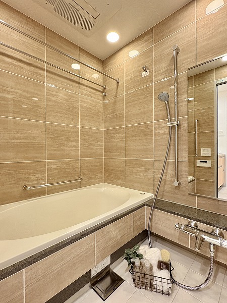 落ち着いた木目調パネルを用いたバスルームは、足をゆったり伸ばせる広々としたバスタブを完備。追い焚き機能により、いつでも簡単にお湯の温度を調整できるのも嬉しいポイントです。さらに浴室乾燥機も搭載されており、雨の日の洗濯や湿気対策にも安心して活用できます。
