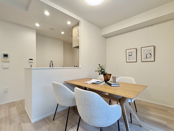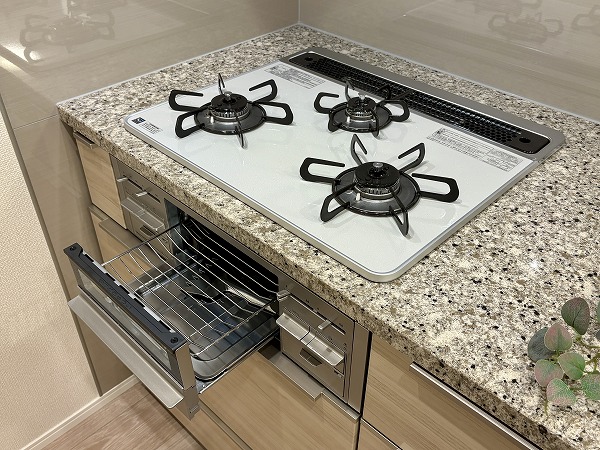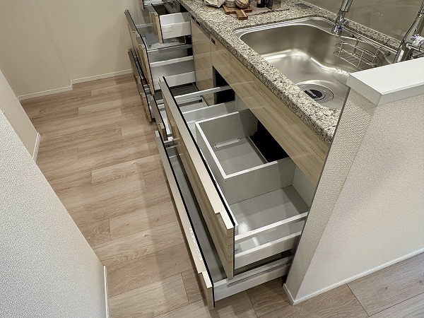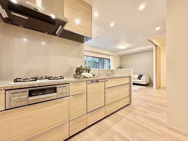 新設されたシステムキッチンは、ご家族が並んで調理できるほど広く、対面式のためゲストや家族と会話を楽しみながら作業できます。ディスポーザーや食洗器を搭載しており、日々の家事を効率よくサポート。収納スペースも十分に確保されており、調理器具や食器の整理もスムーズです。家族みんなが集まりやすいキッチンで、自然と笑顔が増える空間になりそう◎