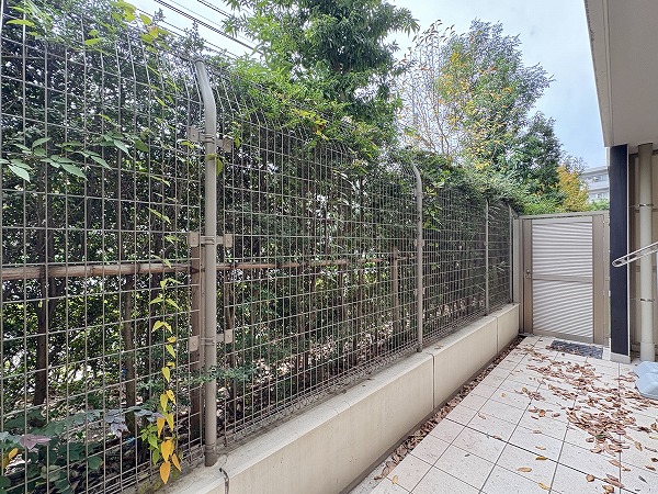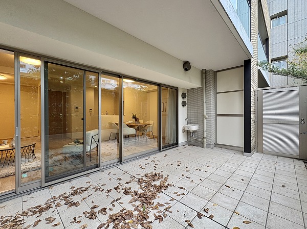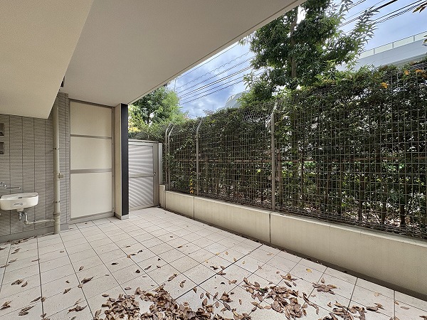 テラスはタイル張りで、雨が降るたびに自然に汚れが流れ落ちる仕組み。1階部分ですがグリーンによる目隠しが施されているため外からの視線は気になりません。テラスチェアを置けば、朝のコーヒータイムや読書の時間を楽しむこともできる、プライベート感のある空間です☀