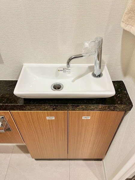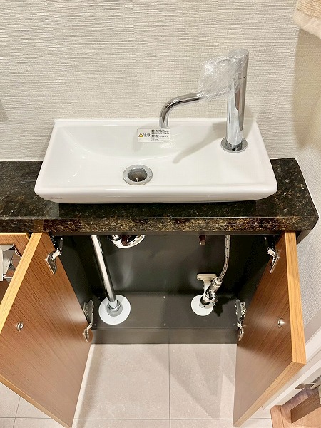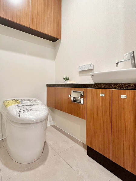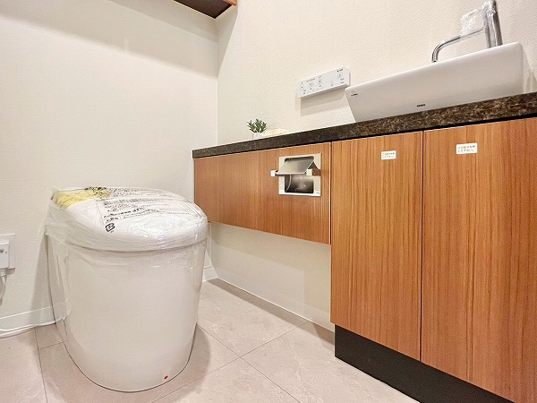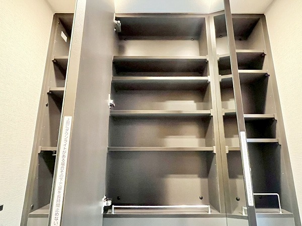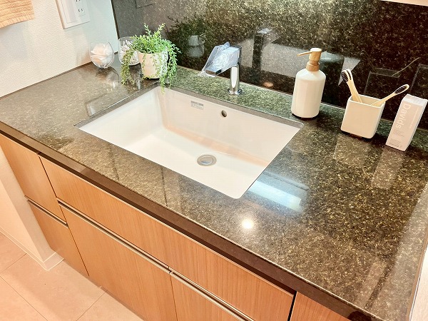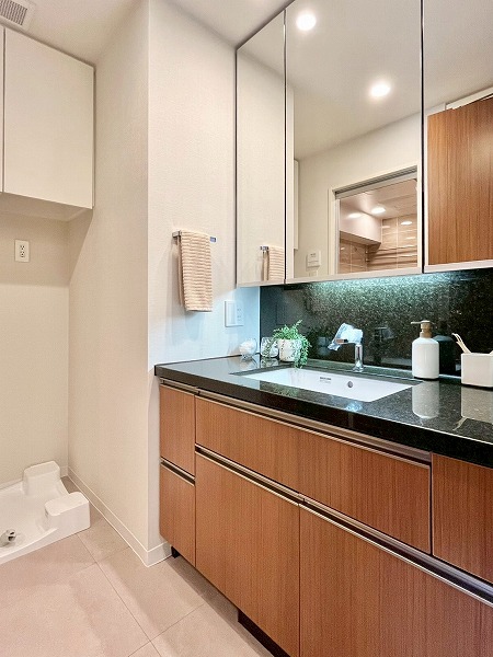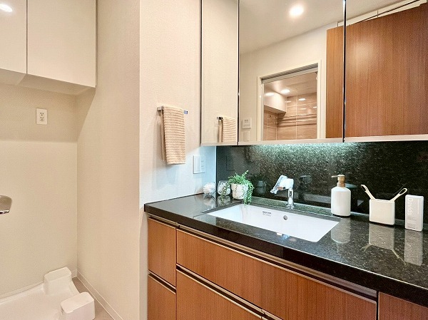 水回りが集合し、使いやすい造りのパウダールームは、ブラックのワークトップがホテルライクで上質な雰囲気を演出。汚れが目立ちにくく、洗面ボウルまでシームレスに繋がる造りはお手入れもしやすそうです。鏡裏や下部に収納スペースを設け、スキンケア用品からお掃除アイテムまでカテゴリーを分けてしまえ、衛生的です。