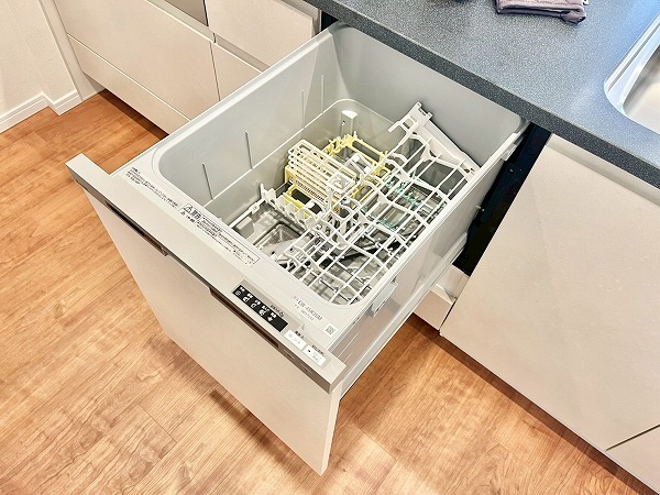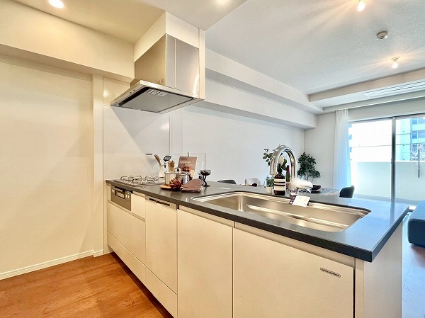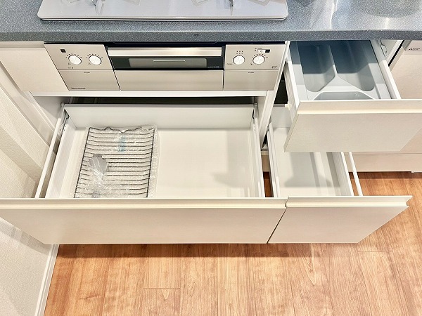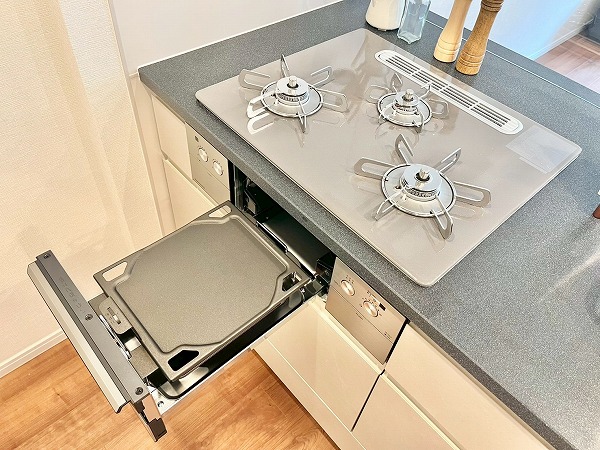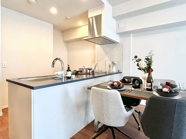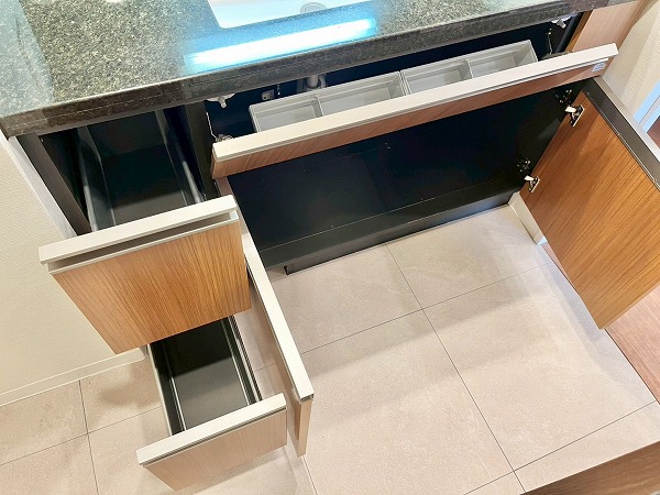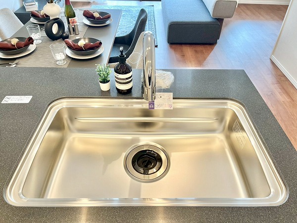キッチンにはオープンタイプが採用され、生活と食事が自然と交わる設計。家族の顔が良く見え、お料理中でもコミュニケーションがしやすいのがうれしいですね。広々としたシンクに3口コンロを備え、日々の調理から特別な日のディナーまでスムーズに準備できます。
