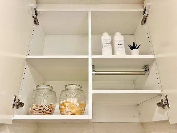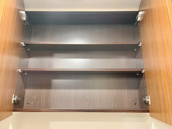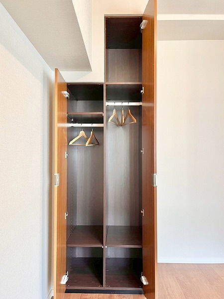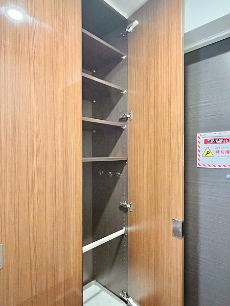 メインルーム内には天井から床まで続くワイドなストッカーを完備。本や書類、ちょっとした文房具類など、日用品を綺麗にしまっておけます。扉が付いているので、充電器などのごちゃつきがちなアイテムを見せない収納が叶い、来客時にも好印象。
